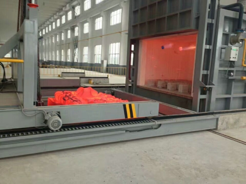 專用叉車設置于爐門前,具有獨立的軌道及傳動裝置,承載工件進出及升降的裝置(爐門前淬火水池深2米),起降范圍:+1米,-2米,材質為Q235,叉車全部采用機械結構,主要由移動機架、鏟腳組合而成,自動叉車能在45s內將工件移入淬火池內。
