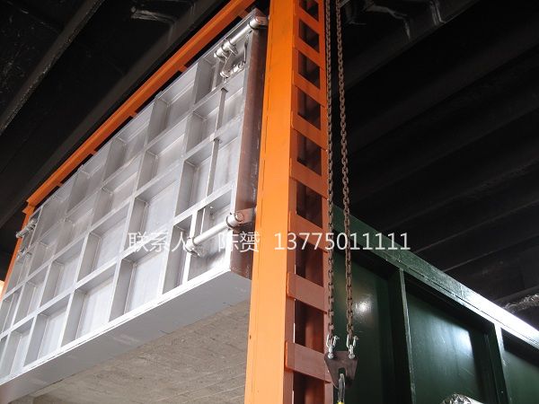 6、 爐門采用高鋁全纖維耐火甩絲毯與型鋼組合框架結(jié)構(gòu),電動葫蘆升降,爐門密封機構(gòu)采用長短杠桿彈簧式自動壓緊凸輪機構(gòu)和軟邊密封裝置。保證上下無摩擦、輕松自如、安全可靠。